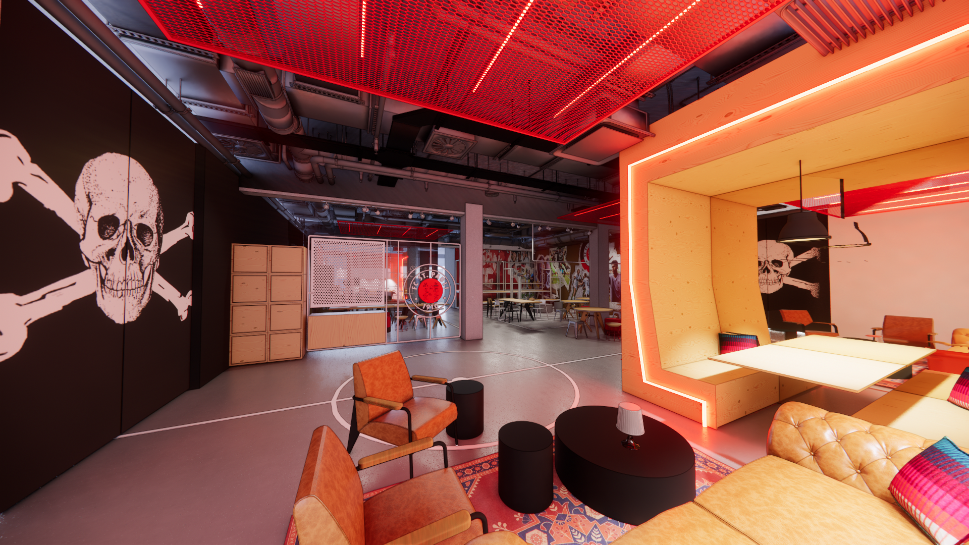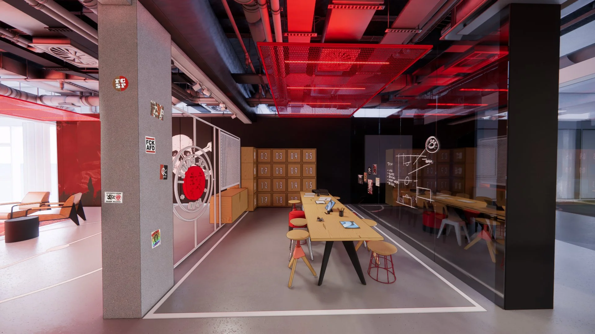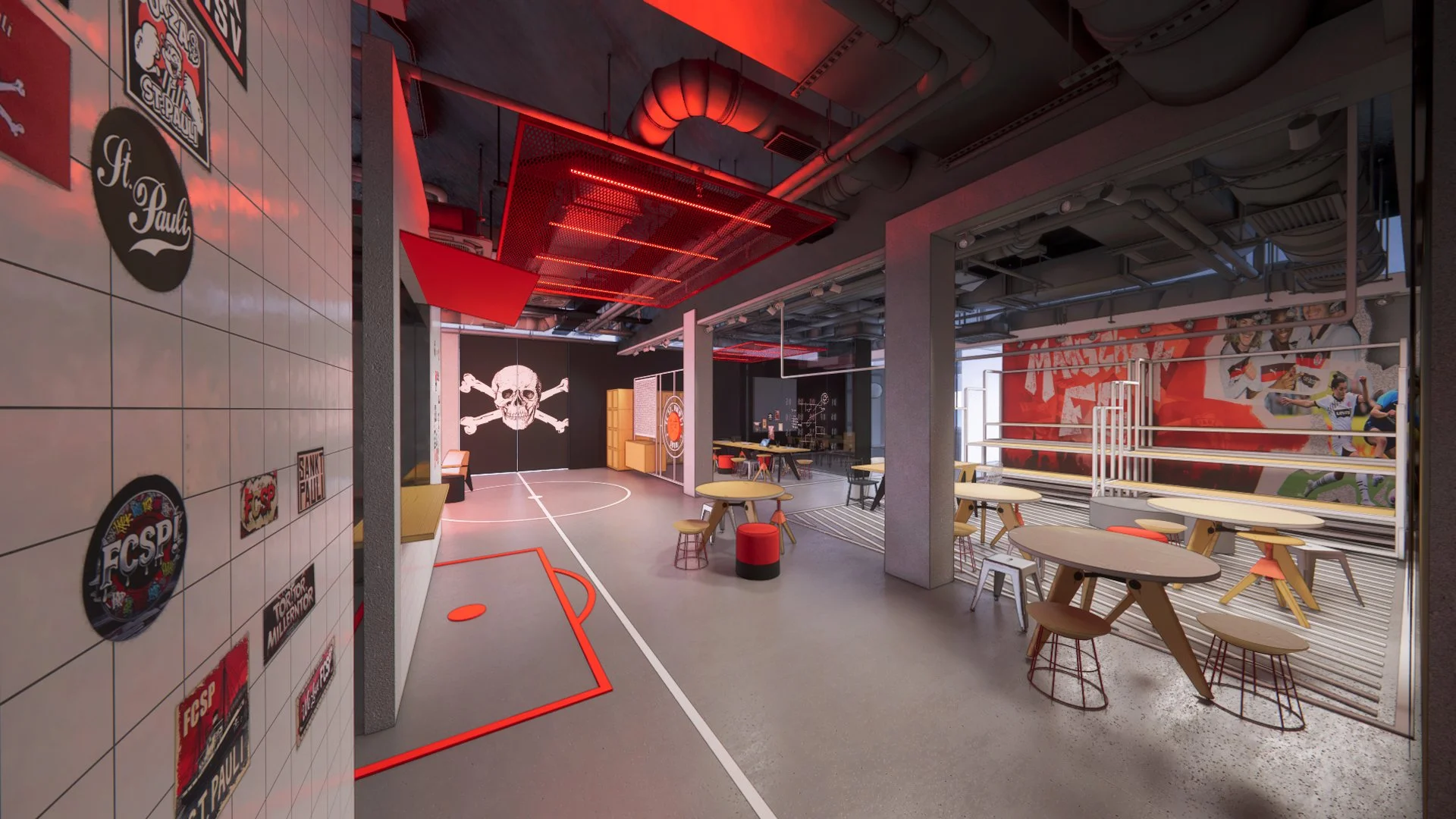 Wir wurden vom Fußballclub St. Pauli beauftragt, die Geschäftsstelle am Millerntor zu überarbeiten. Das Ergebnis: ein Raumkonzept, das ca. 600 QM Büroflächen radikal umgestaltet und den Spirit und das einzigartige Lebensgefühl dieses einzigartigen und traditionsreichen Clubs widerspiegelt. Herausragend war auch die Grundlagenarbeit: ein intensiver und umfangreicher Beteiligungsprozess mit Umfragen und verschiedenen Workshops, in denen die Bedürfnisse und Ideen der Mitarbeiter*innen Gehör fanden. Ergebnis ist ein ganzheitliches Konzept, das perfekt zum Verein und den Mitarbeiter*innen passt: